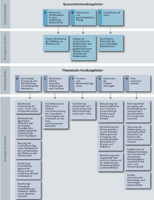 Bioökonomie und zeigt Handlungsbedarf auf. Die Leitgedanken, strategischen Ansätze und Maßnahmen sollen dazu beitragen, die Potenziale der Bioökonomie in Deutschland im Rahmen eines nachhaltigen Wirtschaftens zu nutzen und helfen, den Strukturwandel hin zu einer biobasierten Wirtschaft zu stärken. Die strategischen Ansätze sind mit Blick auf die langfristigen Ziele weiterzuentwickeln und an neue Herausforderungen anzupassen. Der Erfolg der Strategie soll im Rahmen eines Fortschrittsberichts